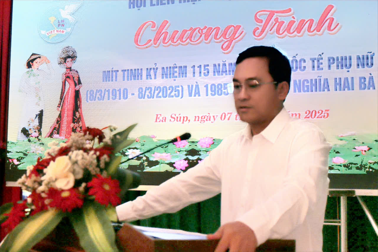 Phát biểu khai mạc lễ mít tinh, đồng chí Nay H’Yến-Chủ tịch Hội LHPN huyện, nhấn mạnh: “ Phát huy truyền thống “Anh hùng bất khuất - Trung hậu - đảm đang” của Người Phụ Nữ Việt Nam, những năm qua, Phụ nữ huyện Ea Súp đã đoàn kết, năng động, sáng tạo, phát huy nội lực, khai thác các lợi thế tiềm năng của huyện, hăng hái thi đua học tập, lao động sáng tạo, chuyển đổi cơ cấu kinh tế, góp phần đẩy mạnh tốc độ phát triển kinh tế của huyện nhà. Các cấp Hội phụ nữ đã làm tốt công tác tuyên truyền, vận động thực hiện các chủ trương, chính sách của Đảng, pháp luật của Nhà nước, các phong trào thi đua “Phụ nữ Huyện Ea Súp tích cực học tập - lao động sáng tạo xây dựng gia đình văn minh hạnh phúc”, triển khai thực hiện hiệu quả nhiệm vụ trọng tâm của Hội, thực hiện tốt việc “Học tập và làm theo tư tưởng, đạo đức, phong cách Hồ Chí Minh”. Phát huy những thành quả đó, Hội LHPN huyện chỉ đạo các cơ sở Hội tiếp tục thực hiện Nghị quyết Đại hội đại biểu Phụ nữ huyện lần thứ 12 và Chủ đề năm thi đua 2025 “ Phụ nữ huyện Ea Súp tích cực tham gia xây dựng Đảng và hệ thống chính trị trong kỷ nguyên mới", gắn với đợt thi đua thực hiện "115 công trình/phần việc - Vì một Đắk Lắk xanh- sạch- đẹp".